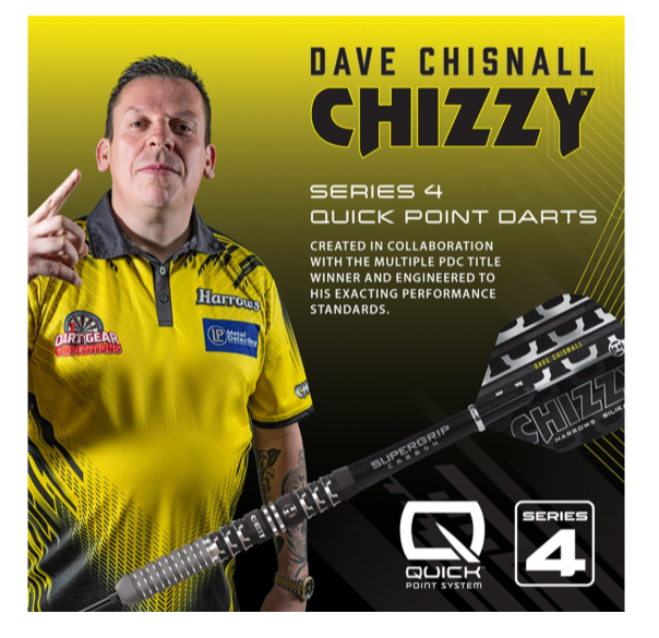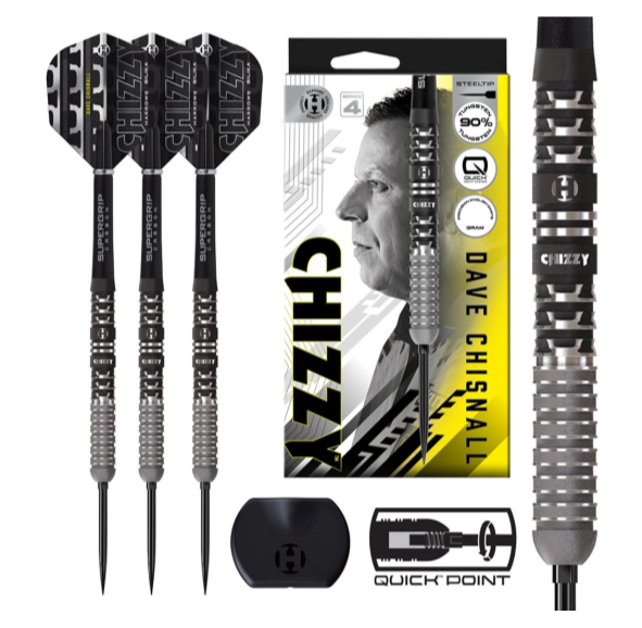 De Chizzy Series 4 darts, ontwikkeld met Dave “Chizzy” Chisnall, bieden ultieme grip, controle en precisie. Gemaakt van 90% tungsten met zwarte titaniumcoating en uitgerust met Quick Point technologie.