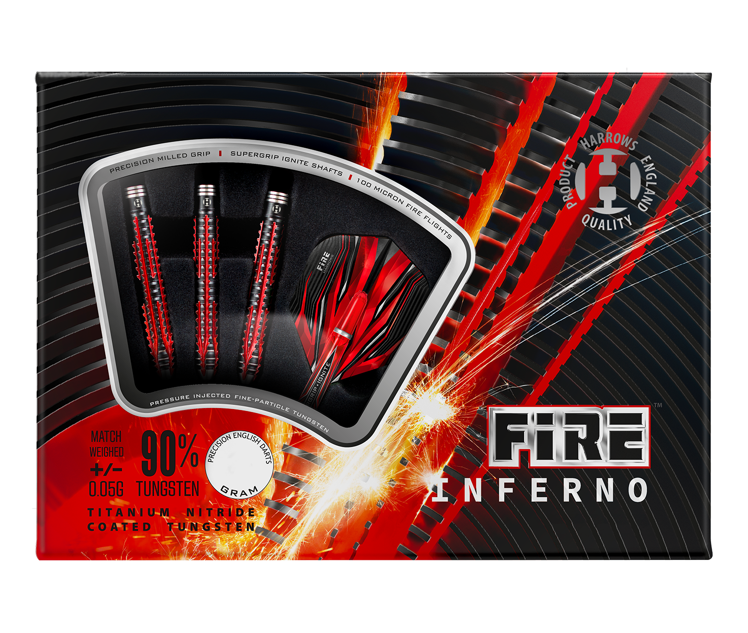 Spuitgegoten met het fijnste 90% wolfraam. Omgekeerde ring insneden, front tapered barrel afgewerkt met sterk een zwart titaniumnitride en metallic rode coating. Wordt geleverd met de nieuwe Red Supergrip Ignite shaft en 100 micron Fire flights.