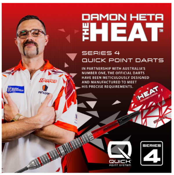 De Damon “The Heat” Heta Series 4 darts, ontwikkeld met Australië’s nummer één, bieden uitzonderlijke grip, controle en precisie. Gemaakt van 90% tungsten met Quick Point technologie en Damons kenmerkende rood-zwarte design.