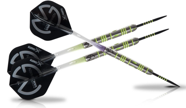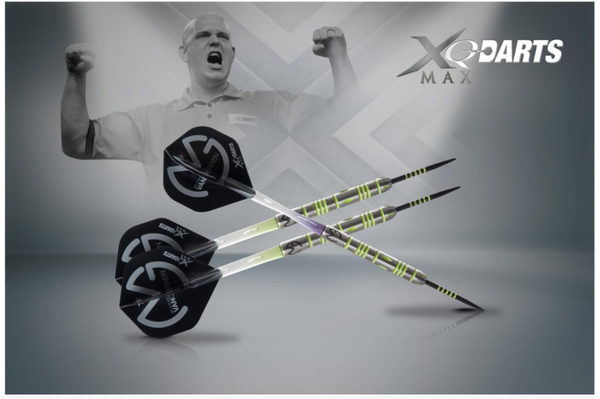 Originele Michael van Gerwen 'Mighty Generation' dartset met 90% Tungsten barrel. Gegraveerd met MVG logo en het XQMax Darts logo.